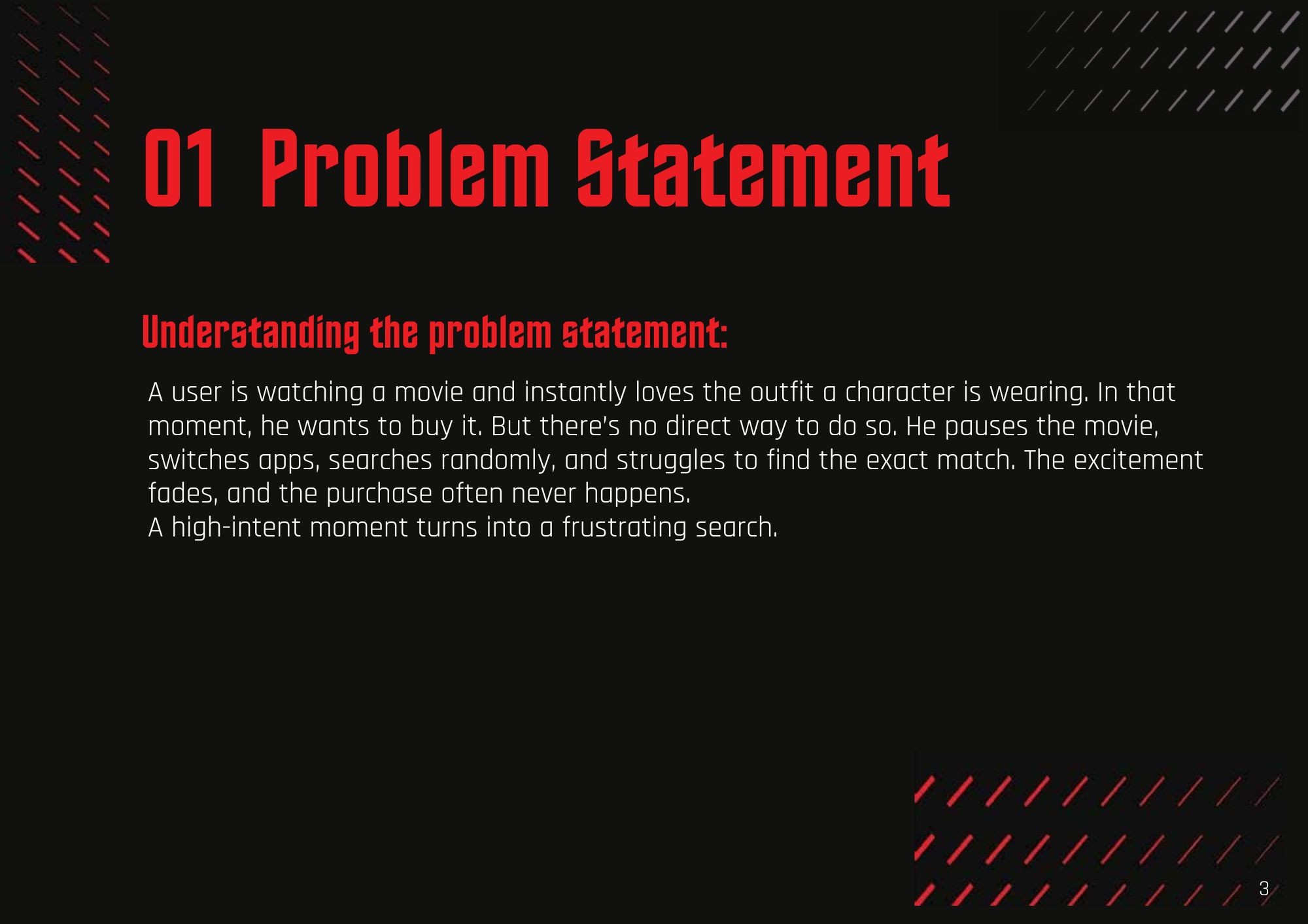 A user is watching a movie and instantly loves the outfit a character is wearing. In that moment, he wants to buy it. But there’s no direct way to do so. He pauses the movie, switches apps, searches randomly, and struggles to find the exact match. The excitement fades, and the purchase often never happens. A high-intent moment turns into a frustrating search.